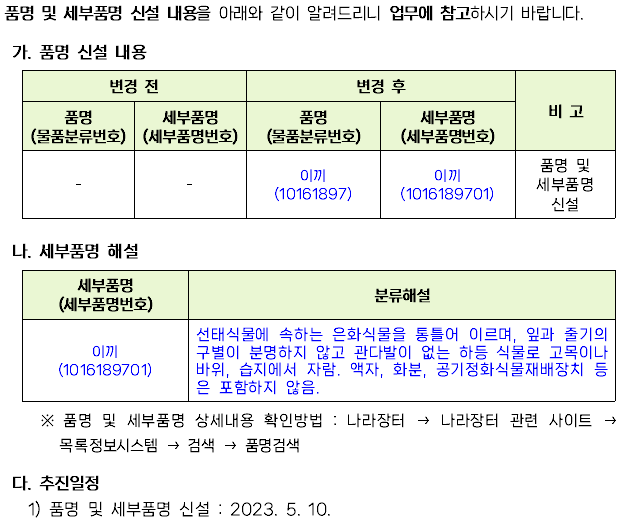 품명·세부품명 신설 알림(이끼)