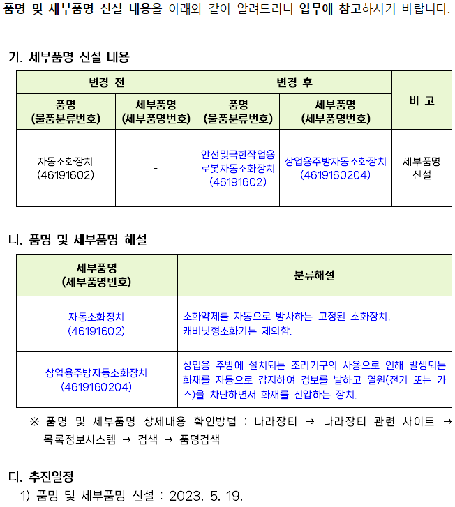 세부품명 신설 알림(상업용주방자동소화장치)