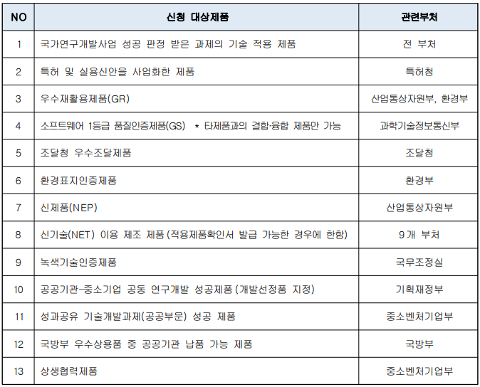 ㅇ 신청대상 : 「중소기업기본법」 제2조에 따른 중소기업이 생산하는 기술개발제품 중 아래 기준을 만족하는 제품