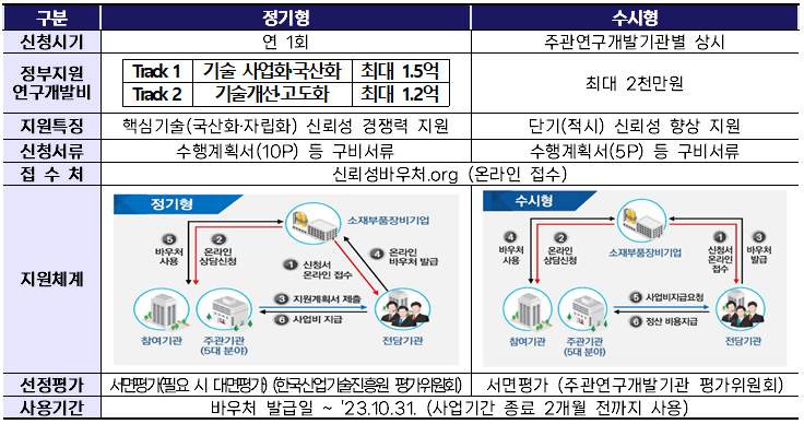 - (정기형) 소재·부품·장비의 신뢰성 및 소재 성능 향상을 위해 중장기에 걸쳐 프로젝트 형태로 종합 지원하는 유형('23년 신청마감)