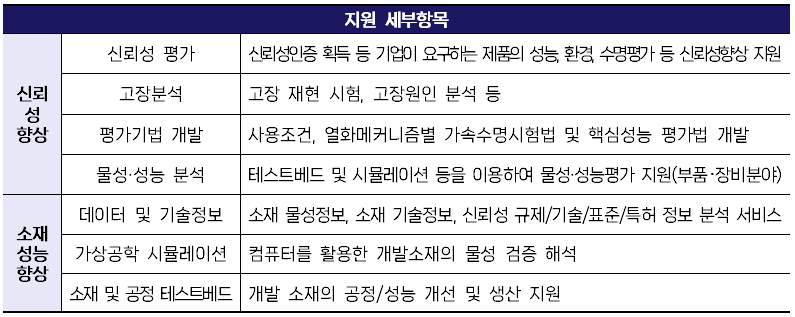 ㅇ 사업목적 : 소재부품장비 글로벌 경쟁력 확보를 위해 중소․중견기업을 대상으로 연구개발기관(서비스 지원기관)의 인프라(인력·장비 등)를 활용하여 신뢰성 및 소재 성능 향상 지원