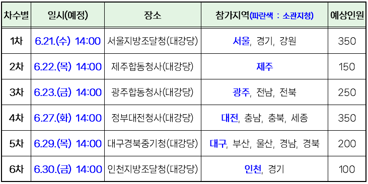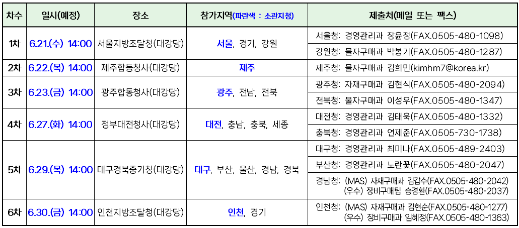○ 각 권역별 설명회 장소의 수용인원이 한정되어 있으니 수요기관 및 업체별 2명 이내로 참석하여 주시기 바랍니다.