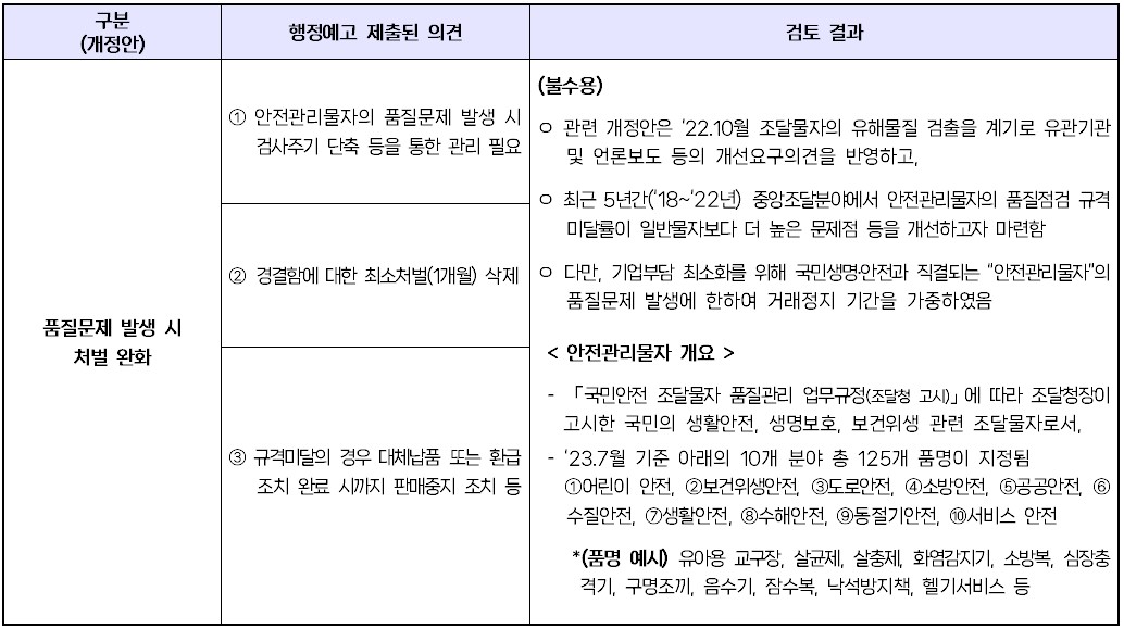 ㅇ 물품구매계약 품질관리 특수조건 개정(안)에 대한 행정예고 의견 검토 결과