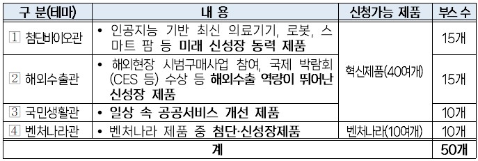 ○ 신청 대상 : 혁신제품(첨단바이오관, 해외수출관, 국민생활관), 벤처나라 제품(벤처나라관)