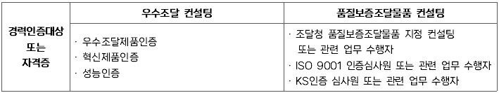 1. 모집분야 : 우수조달 컨설팅(0명), 품질보증조달물품 컨설팅(0명)