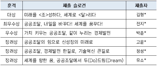 * 당초 우수상까지 3인 선정 예정이었으나, 우수한 슬로건이 많아 장려상 3인 추가 선정(장려상은 상품으로 문화상품권 10만원 시상 예정)