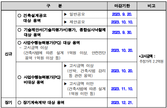 □ 2023년도 연내 계약체결이 필요한 건설기술용역의 계약요청 마감기한을 다음과 같이 안내하오니 , 귀 소관 용역 계약요청 시 행정소요일수를 감안하여 마감기한 전까지 계약 요청하여 주시기 바랍니다 .