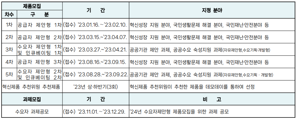 - 조달청과 국가기관․공공기관․지방자체단체가 공동으로 공공 과제를 발굴하고, 세부 과제를 기획하여 혁신제품을 모집하는 방식