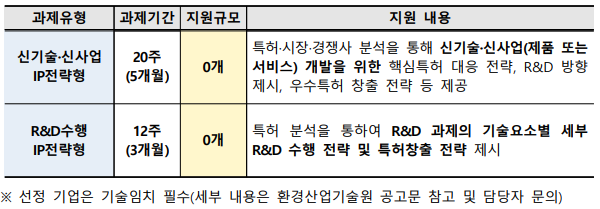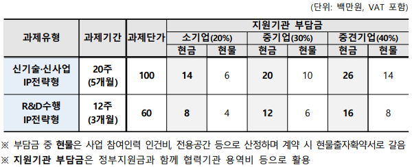 - 지원자격 : 위 지원대상에 해당하고 연계기관의 세부 자격요건을 충족하는 ‘IP-R&D 사업 연계 대상기업’에 한함
