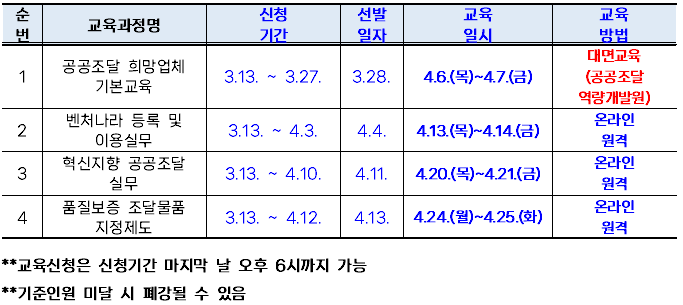 - 공공조달 희망업체 기본교육: 60,000원(기숙사비, 식비 별도)