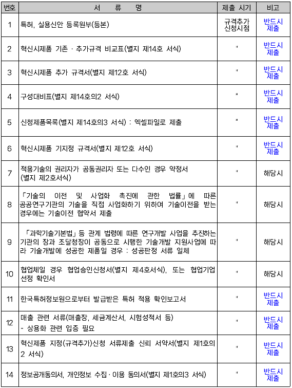 - 자세한 신청서류 제출방법은 붙임문서 "혁신시제품 규격추가 온라인 신청매뉴얼" 참고