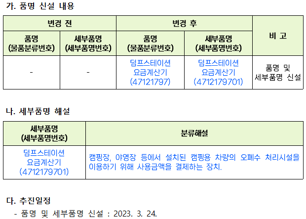 품명 및 세부품명 신설 알림(덤프스테이션요금계산기)
